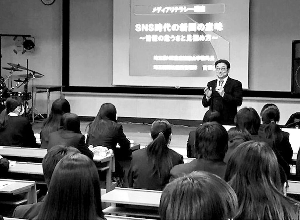 講師を務めた本紙編集局の吉田俊一編集管理幹は、SNSの登場によって、「1億総メディア化」時代が到来したと強調。「便利になった半面、不正確な情報が発信されたり、中には詐欺やアクセスを稼ぐためにわざとうそやデマを流すケースもある」と、人工知能(AI)で作成されたフェイク動画などの実例を挙げて指摘した。