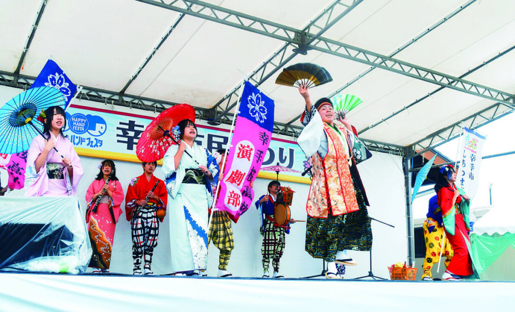 「とざい、とーざい。寄ってらっしゃい、見てらっしゃい」。10月26日、幸手市の県営権現堂公園で開かれた幸手市民まつり。雨の中、時代劇のような格好をした演劇部がステージに登場した。この日は「おてもやん」「東京ブギウギ」など6曲を披露。演奏に誘われて観客が集まり、拍手で終演を迎えた。