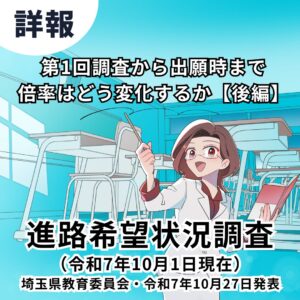 市立川越は2年連続の大幅低下で令和5年度以来3年ぶりの2倍台となりました。過去の傾向を見ると、第2回調査から実際の出願にかけて倍率は急激に下がり、最終的には1.2~1.4倍台に落ち着いています。
