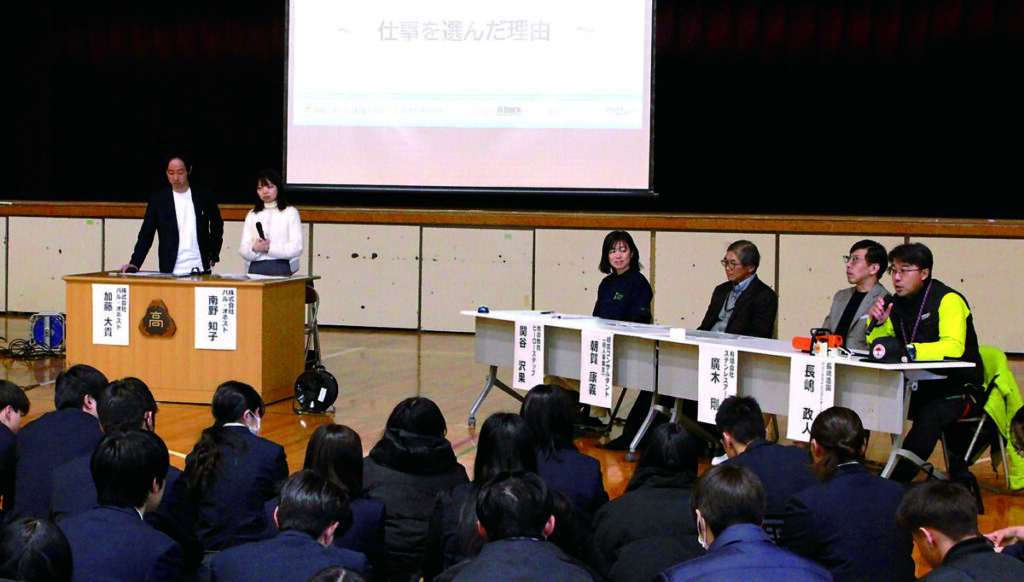 今回は2年生約170人が参加。地元の金融機関や同市に本社を置く企業関係者が登壇して、「仕事を選んだ理由」「働くことの本質」などを、それぞれの言葉で伝えた。
