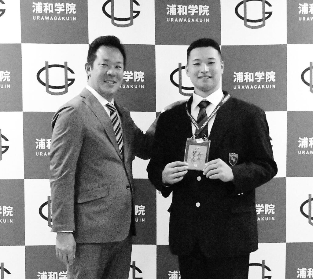 巨人の大場スカウト(左)からドラフト6位指名のあいさつを受ける浦和学院の藤井健翔内野手=29日、さいたま市緑区