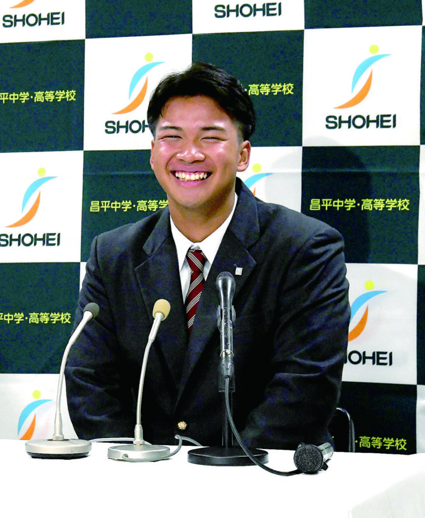 ロッテから4位指名を受けて笑顔で会見に臨んだ昌平高の桜井ユウヤ内野手=23日午後、杉戸町下野