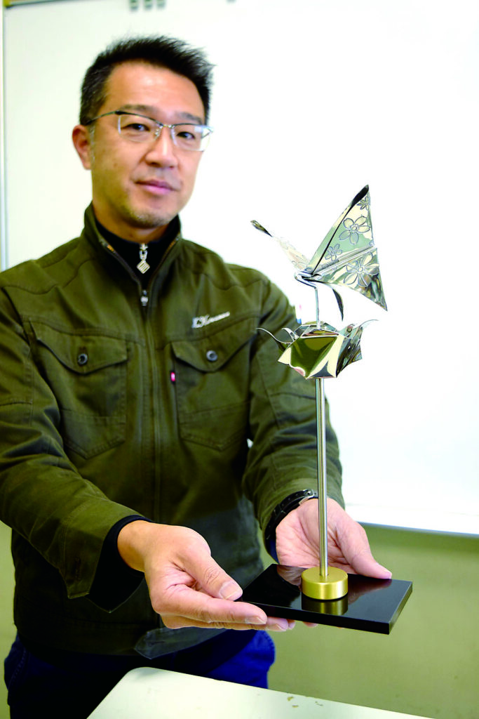 黒沢さんは2年前、ステンレス製の折り鶴を制作し、東松山市の平和資料館に寄贈している。被爆地の職人が終戦の日に折り鶴を作っていたことを知ったのがきっかけだった。今回もメッセージ性のある作品を創造しようと考え、「いろんな金属を使って、自然の美しさや力強さ、共生の大切さを表現した」。