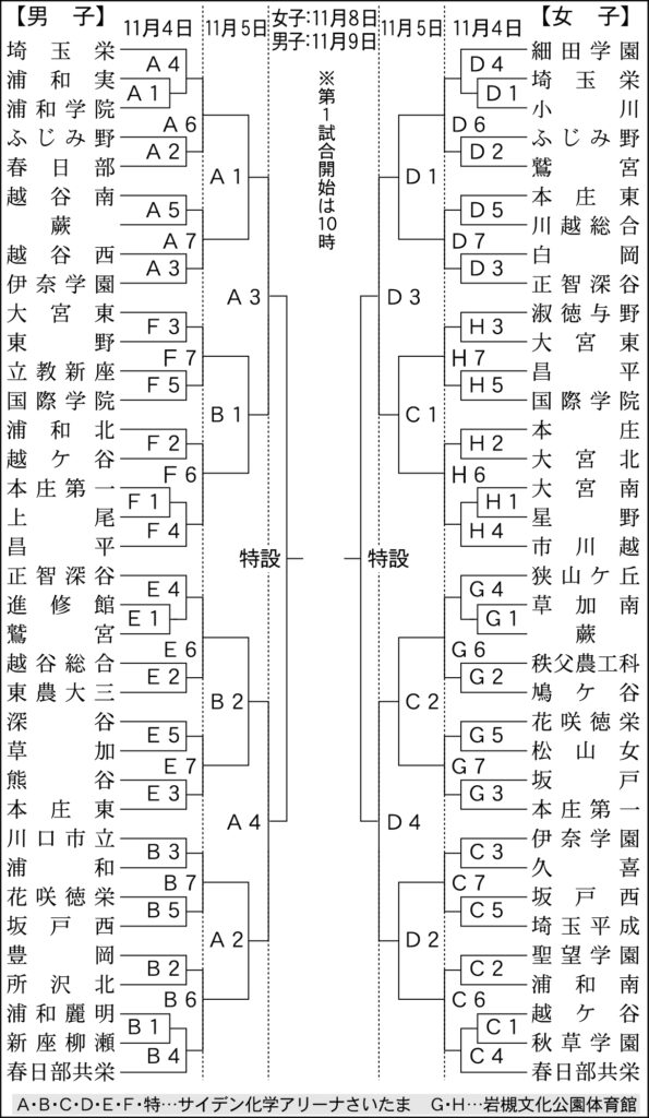 男子の第1シードは2大会連続の県制覇を目指す埼玉栄。第2シード以下は春日部共栄、正智深谷、昌平と続いた。女子の第1シードは2大会ぶりの春高出場を狙う細田学園。第2シード以下は春日部共栄、狭山ケ丘、市川越が入った。