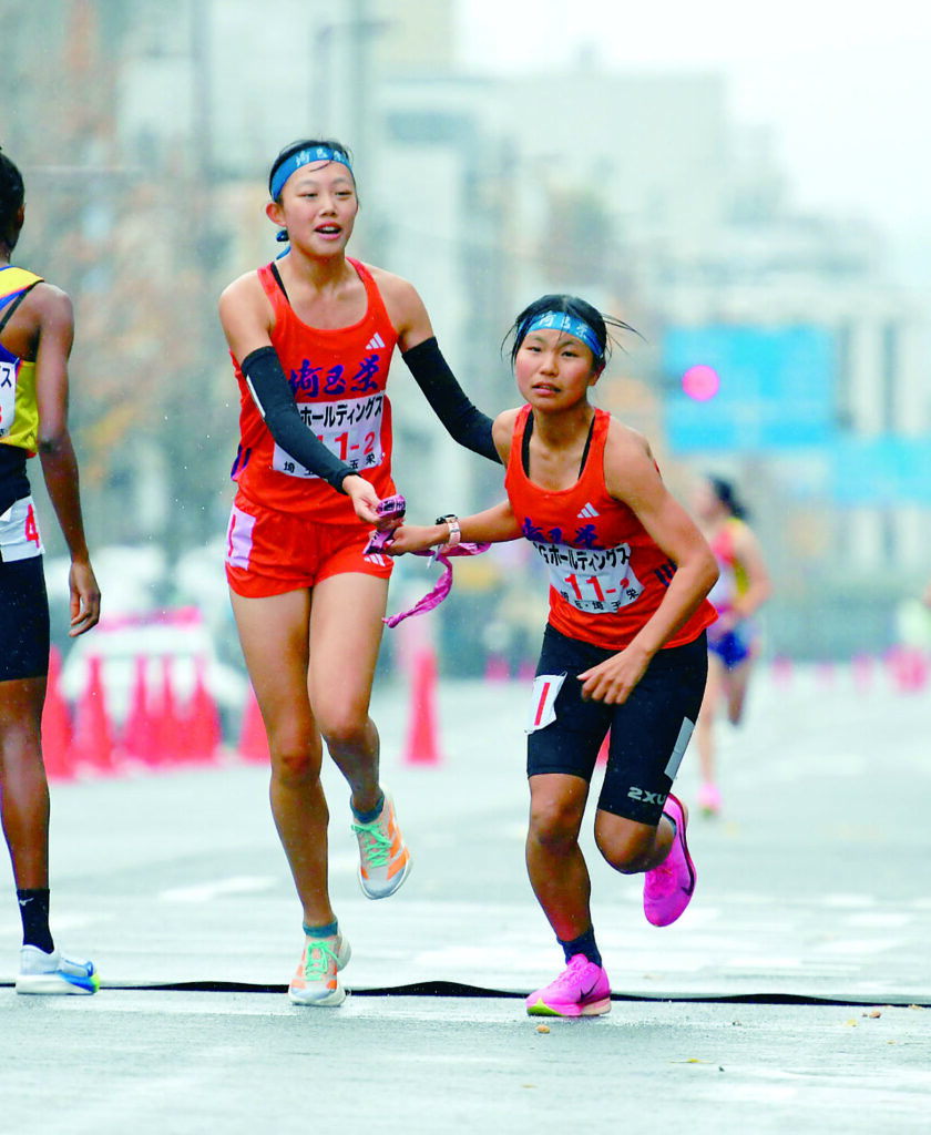 女子 2区松浦(左)から3区久保田にたすきが渡る