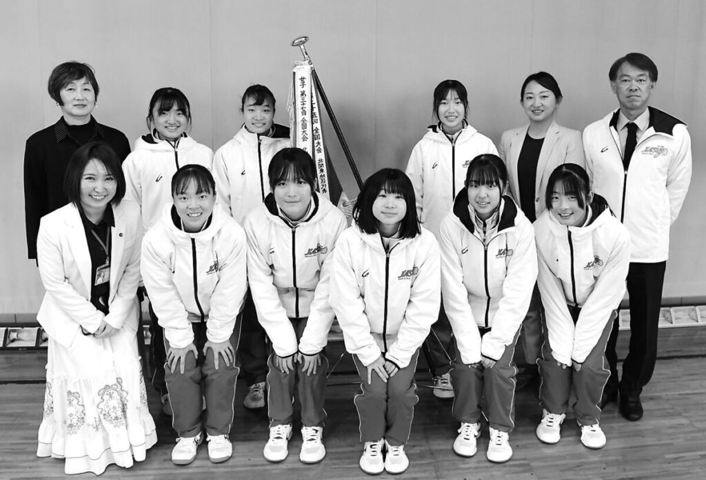 壮行会に出席した春日部女の駅伝チームの選手たちと照沼直紀監督(右)、同校OGたち=12日午後、春日部市内の同校