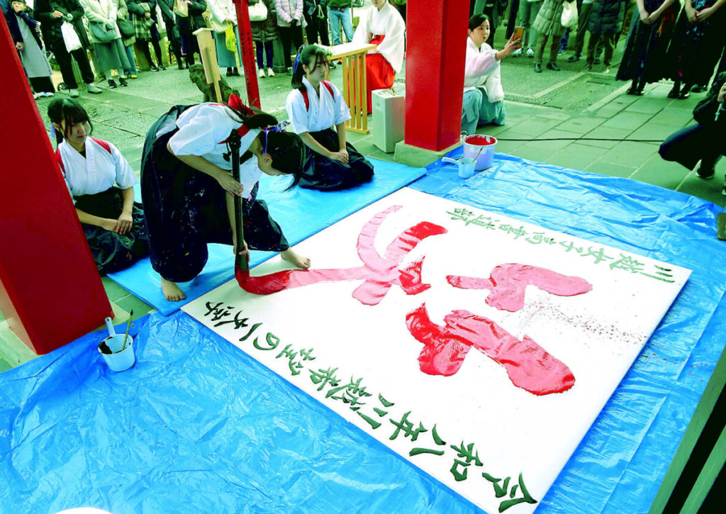 2026年への願いを込めた「川越希望の一文字」が川越市南通町の川越八幡宮で発表され、「笑」に決まった。多くの参拝客が見守る中、県立川越女子高校書道部の生徒が1・8㍍四方の紙に赤色で、力強く「笑」の一文字を揮毫(きごう)した。作品は1年間、境内に飾られる。