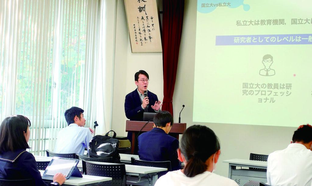 同校は、来年度から国公立大学に現役で合格することを目指す「N―uni(National University route)コース」を新設。講演会では埼玉大学理工学研究科の渡部康平准教授が、「国立大学はどれだけお得?~私立大学との比較で見る国立大学の魅力~」をテーマに、「国立大学は私立大学と比べて2倍くらいお得というのが一般的な常識だが、科学研究費獲得で見る研究力や教員1人当たりの学生数を考えると32倍コストパフォーマンスが良い。特に地方の国公立大学はその土地の文化や風土に触れることで視野を広げ、1人暮らしの経験も自己解決能力を育みタフな人材になる」と魅力をアピールした。