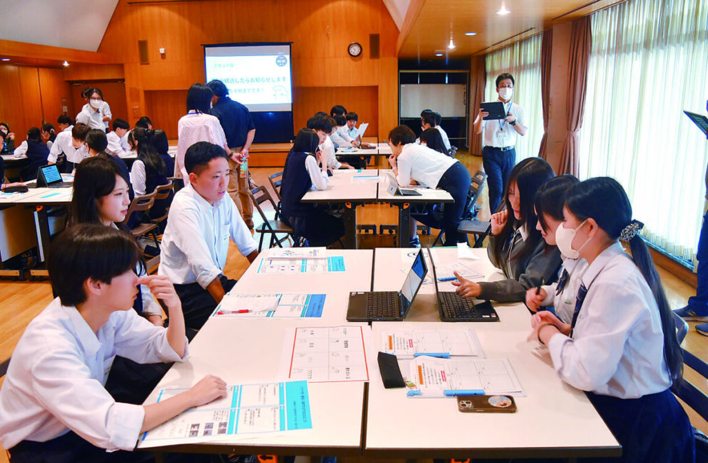生徒たちは6月から実施してきた児玉地域の文化・産業の魅力発信に向けて、チームで活動した内容の中間報告を実施。笑顔を見せながら交流を深めていた。