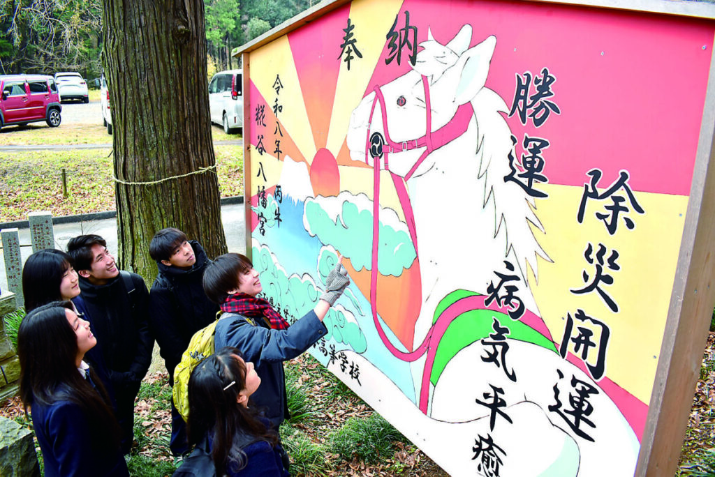 絵馬は昨年から引き続き2回目の奉納。同校美術科1年生の有志6人が、放課後などを使って約1カ月かけて制作した。大きさはおよそ縦185㌢、横280㌢。白馬はほほ笑んでいるような表情で、朝日や富士山のグラデーションが繊細に表現された。絵馬を描いた金子向日葵さんは、「日本画をイメージして、見た人にいいことがありますようにという思いを込めた」と話した。