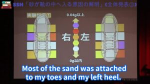 「走る際に砂が舞って服を汚くすることを不快に感じた」という、自身の日常での気付きから生まれた発表。靴の部位ごとの砂の付着量の計測や実験装置の自作など、視覚的に目を引く実験が多い。