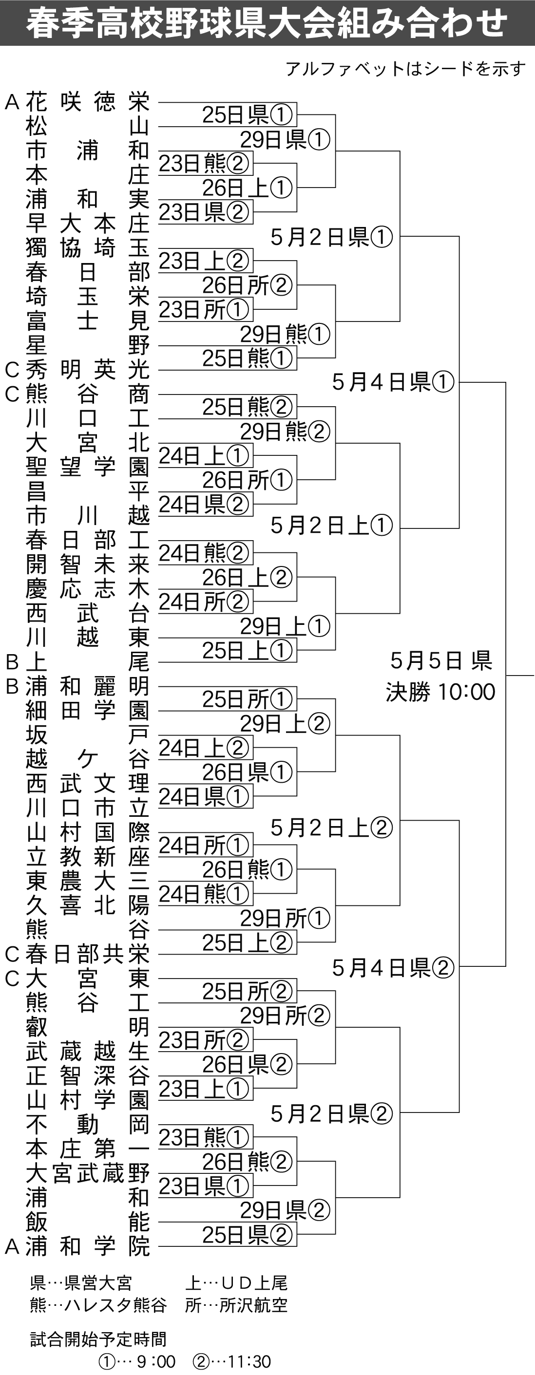 昨秋の県大会で4年ぶりに4強に入ったBシード上尾の初戦は前回大会4強の川越東に決まった。春では初のBシードとなった浦和麗明は初戦で細田学園とぶつかる。このほか秋季県大会8強のCシード勢の初戦は熊谷商が川口工、春日部共栄が熊谷、大宮東が熊谷工、秀明英光が星野とそれぞれ対戦する。