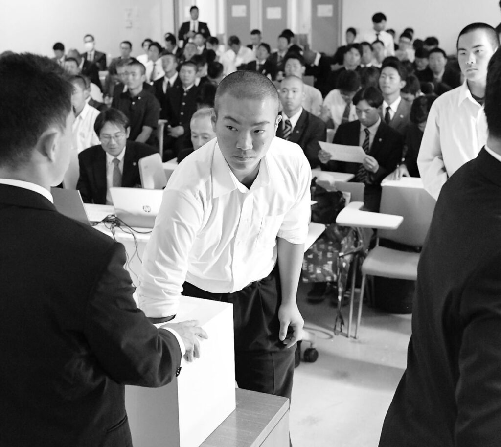 緊張の面持ちでくじを引く各校の主将ら=20日午後、上尾市のスポーツ総合センター