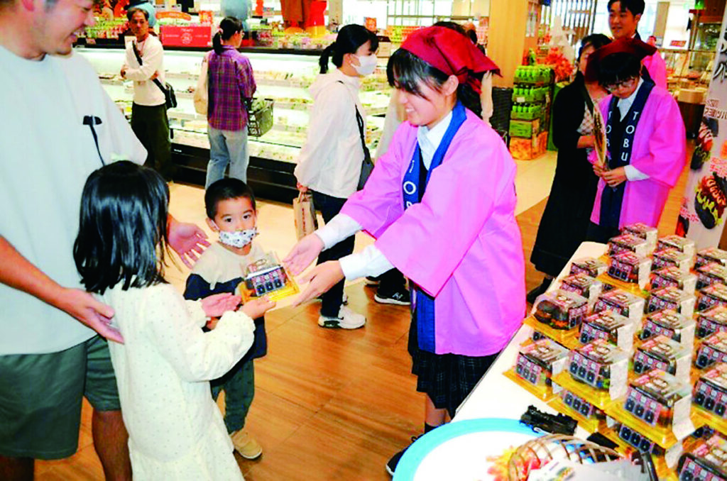 東武ストアの法被を着て販売する生徒=宮代町の東武ストア東武動物公園駅前店
