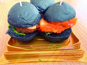 同校と東武鉄道・東武ストアのコラボは2回目で、人気SL「大樹」の車内でのワンハンドフードをコンセプトに、SLのボディーや動輪を想起させる「竹炭パウダー」をバンズに練り込んだミニバーガーを完成させた。