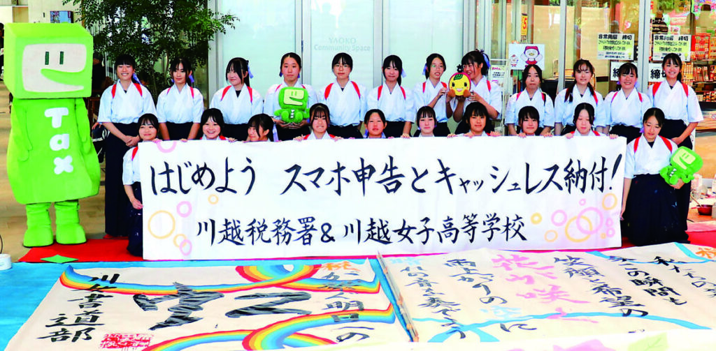 川越市の川越税務署(竹野健一署長)と同署管内税務協力団体協議会(原敏成会長)は、同市新宿町のウニクス川越で県立川越女子高校書道部の協力で「税の書道パフォーマンス」を行った。