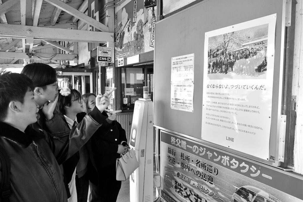 駅のポスターを見た同校3年の黒沢涼華さん(18)、吉田蒼太朗さん(18)、田形勇吹さん(18)は「地域の方のおかげで、生徒数が少なくても、全く寂しくない3年間だった」「学校全体の卒業式でもあるので、参加者全員をたたえ合いたい」と声を弾ませ、学校へ向かった。