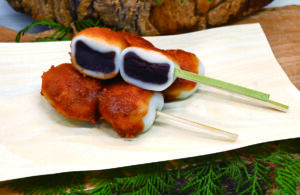 辛みそだれがかかり、あんこ入りのだんご「東松山さんぽ」