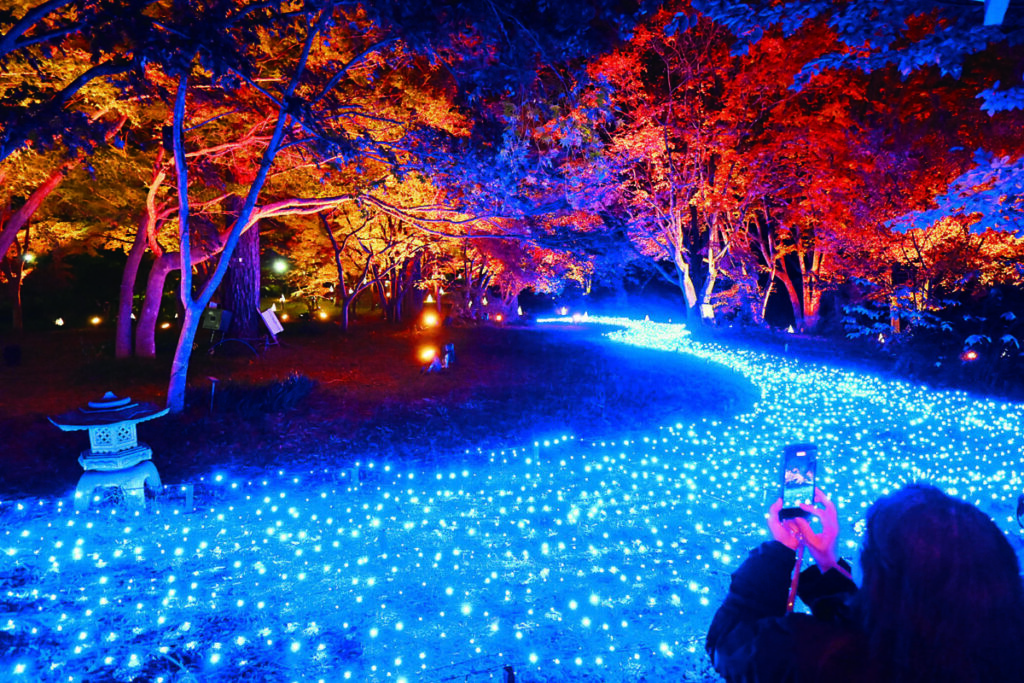 滑川町山田の国営武蔵丘陵森林公園で、カエデの紅葉が見頃を迎えた。夜にはイルミネーションやライトアップで色づいた木々を演出するイベント「紅葉見ナイト」が30日まで開催中。紅葉と色とりどりの光の競演で来園者を魅了している。