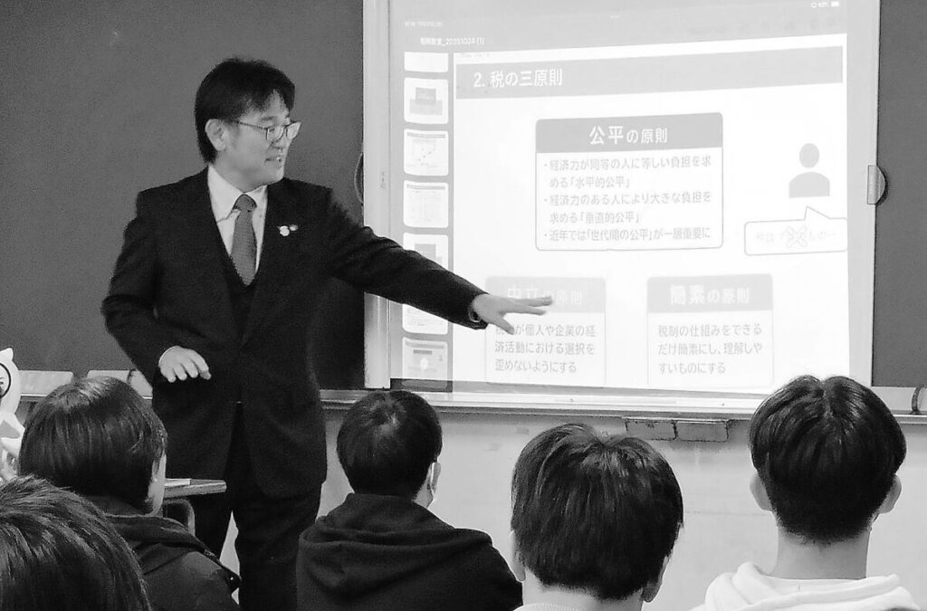 成年年齢の引き下げで、18歳から親の同意がなくてもクレジットカードを作ったりローンも組めることから、住民税や所得税などの仕組みやお金の流れを中心に学習。生徒たちは「教科書よりも実践的で理解が深まった。税についてあまり考えてこなかったが、自分の将来にも関わることなので、これからはもっと考えるようにしたい」などと話していた。