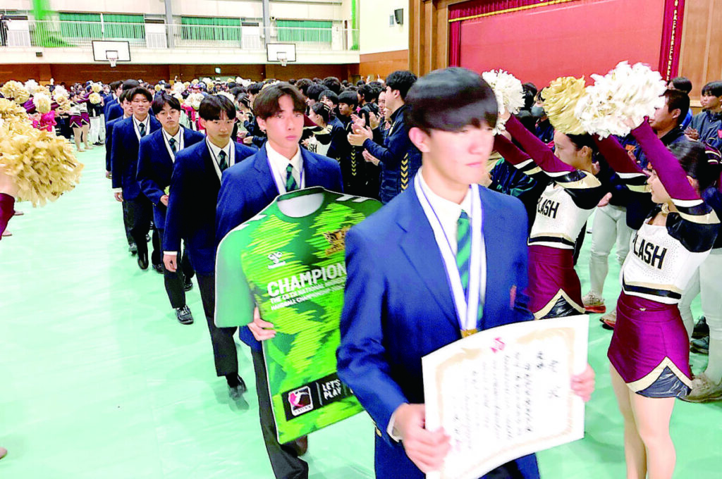 報告会では、女子のソングリーダー部の祝勝セレモニーが披露され、部員22人が優勝旗などを掲げながら入場。最優秀選手の高山飛翼さん、優秀選手の松本晴空さん、對島向陽さん、永井逸晟さんらが紹介されると、会場は大きな拍手に包まれた。