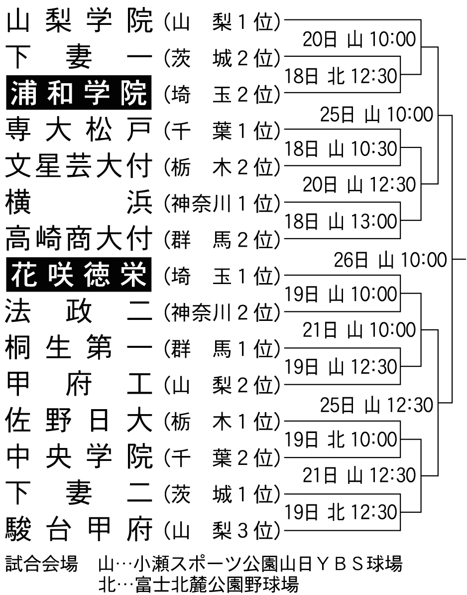 秋季県大会で2年ぶり8度目の優勝を決め、16度目の秋季関東大会に挑む花咲徳栄は、19日の1回戦で法政二(神奈川2位)と対戦する(10時・山日YBS球場)。県大会準優勝で3年ぶり20度目出場の浦和学院は、18日の1回戦で下妻一(茨城2位)と顔を合わせる(12時30分・富士北麓公園野球場)。