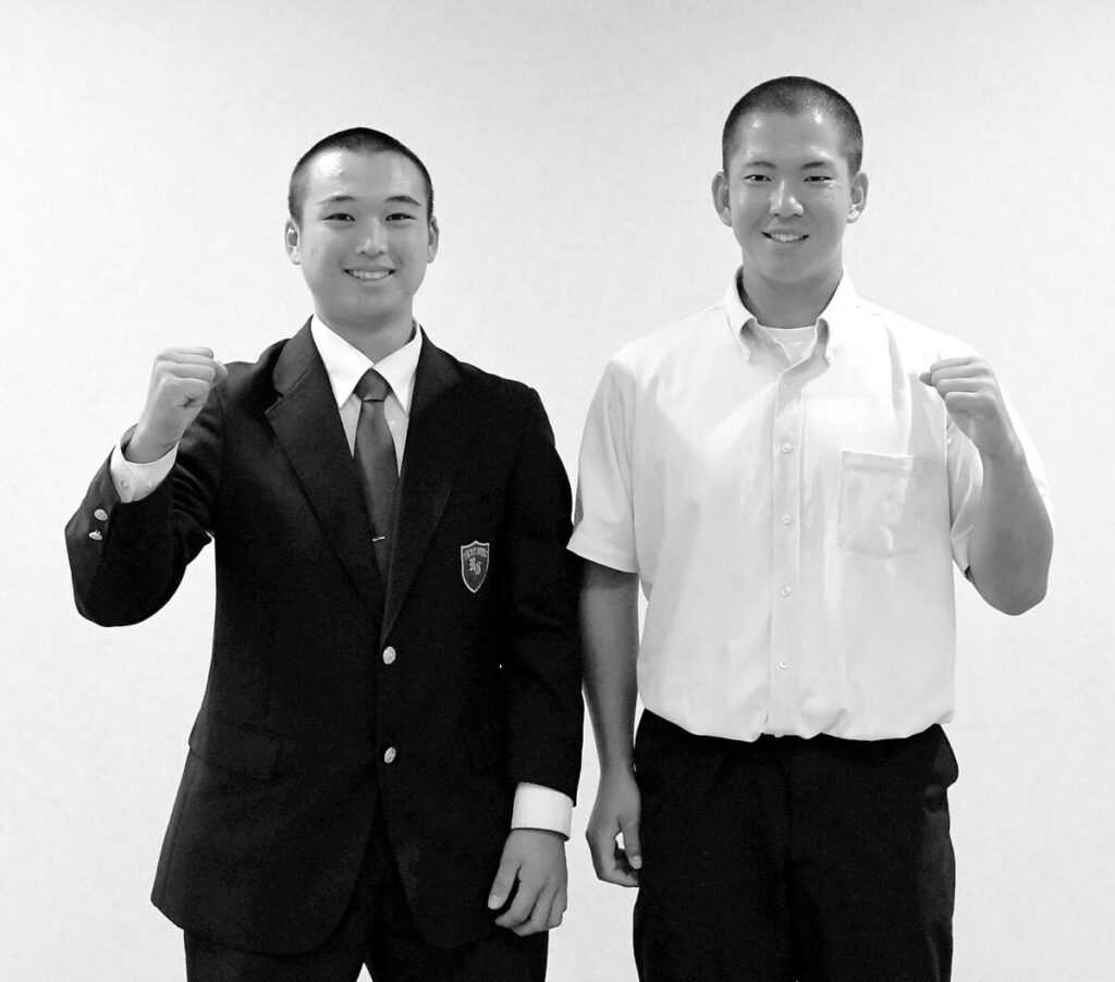 抽選会に臨んだ花咲徳栄の本田新志主将(右)と浦和学院の蜂巣祥万主将=9日午後、東京都内