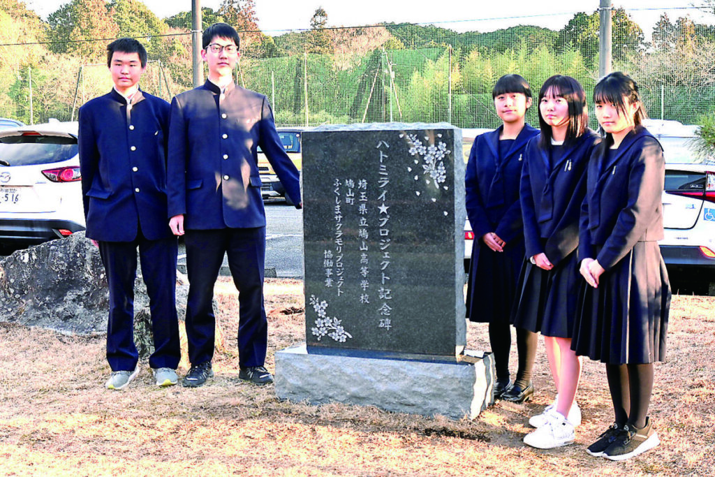 県立高校再編のため今年度で閉校となる県立鳩山高校は、鳩山町などと協働で行った「ハトミライ☆プロジェクト」の記念碑を、統合先の県立越生高校の敷地内に設置した。東日本大震災の被災地支援と鳩山町の活性化のため、生徒の発案で始まったプロジェクト。これまで町内各地に福島県の桜を植樹してきた思いを、新しい高校に伝える。