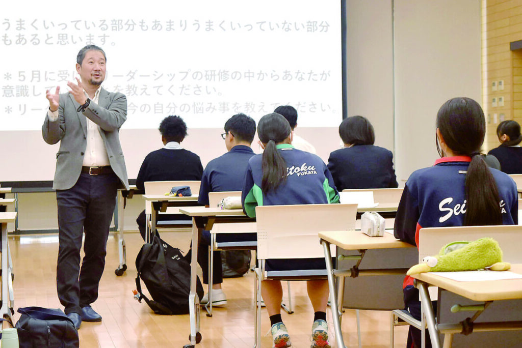 深谷市宿根の東京成徳大学深谷高校で10月28日、「第2回運動部対象リーダー研修会」が行われ、城西大学経営学部マネジメント総合学科の柴沼真教授が講師を担当し、運動部の生徒28人が参加した。