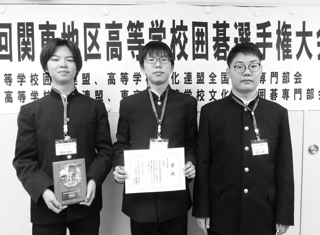 関東高校囲碁選手権の団体戦で準優勝した春日部の(左から)橋本航太さん、横山蒼大さん、北崎友彬さん=17日午後、日本棋院