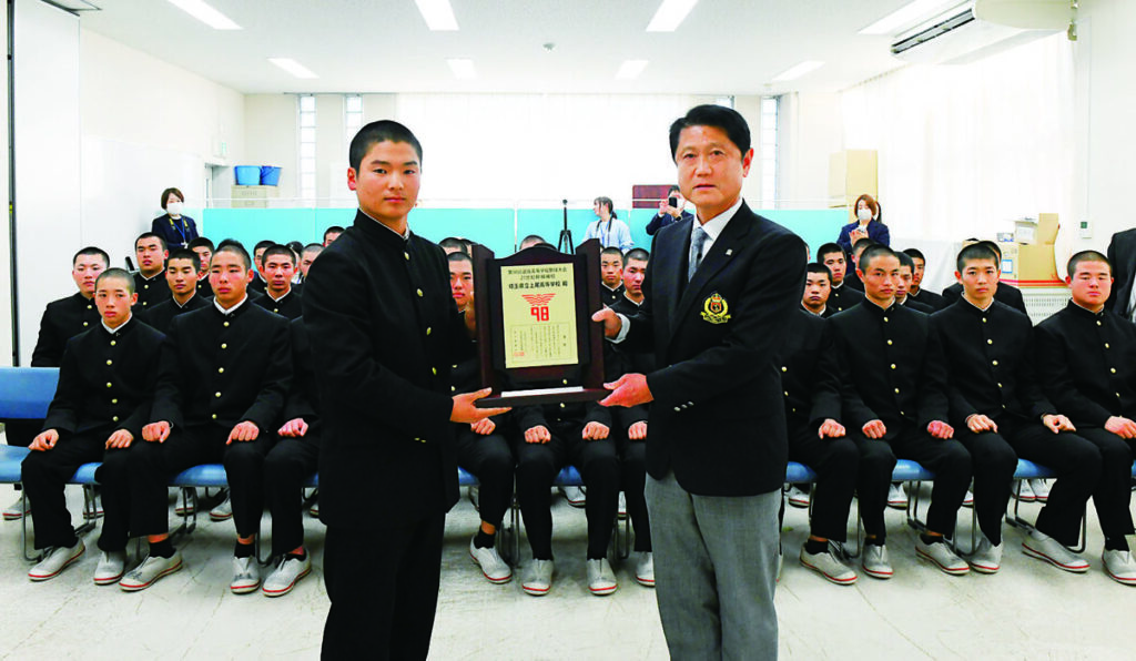 大会関係者、学校関係者らや野球部の全部員45人が出席。記念盾が毎日新聞社の伊藤直考さいたま支局長から県高校野球連盟の斎藤明博会長に手渡され、その後、チームを代表して森田主将に送られた。