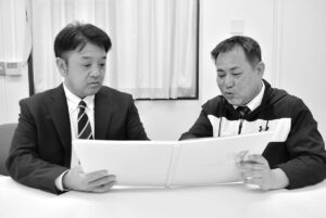 伊藤ヴィットル選手が卒業した本庄第一高校時代の卒業アルバムで当時を振り返る中村大輔さん(右)と田中康敬さん=5日午後、本庄市仁手の本庄第一高校